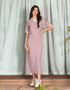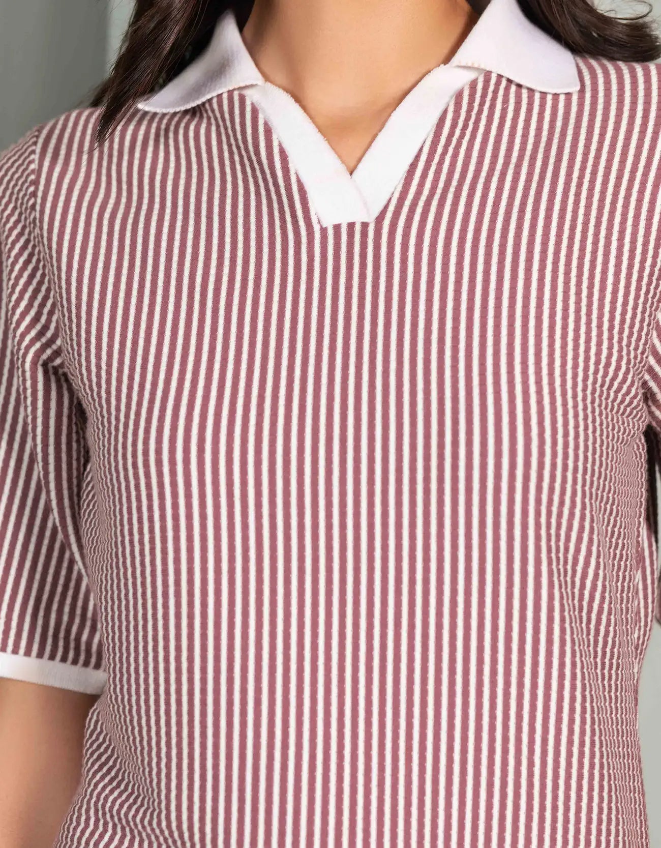 Slim fit midi dress in yarn dyed knitted fabric with jhonny collar and short sleeves. Rib detail around sleeve opening. Slit detail at the side.