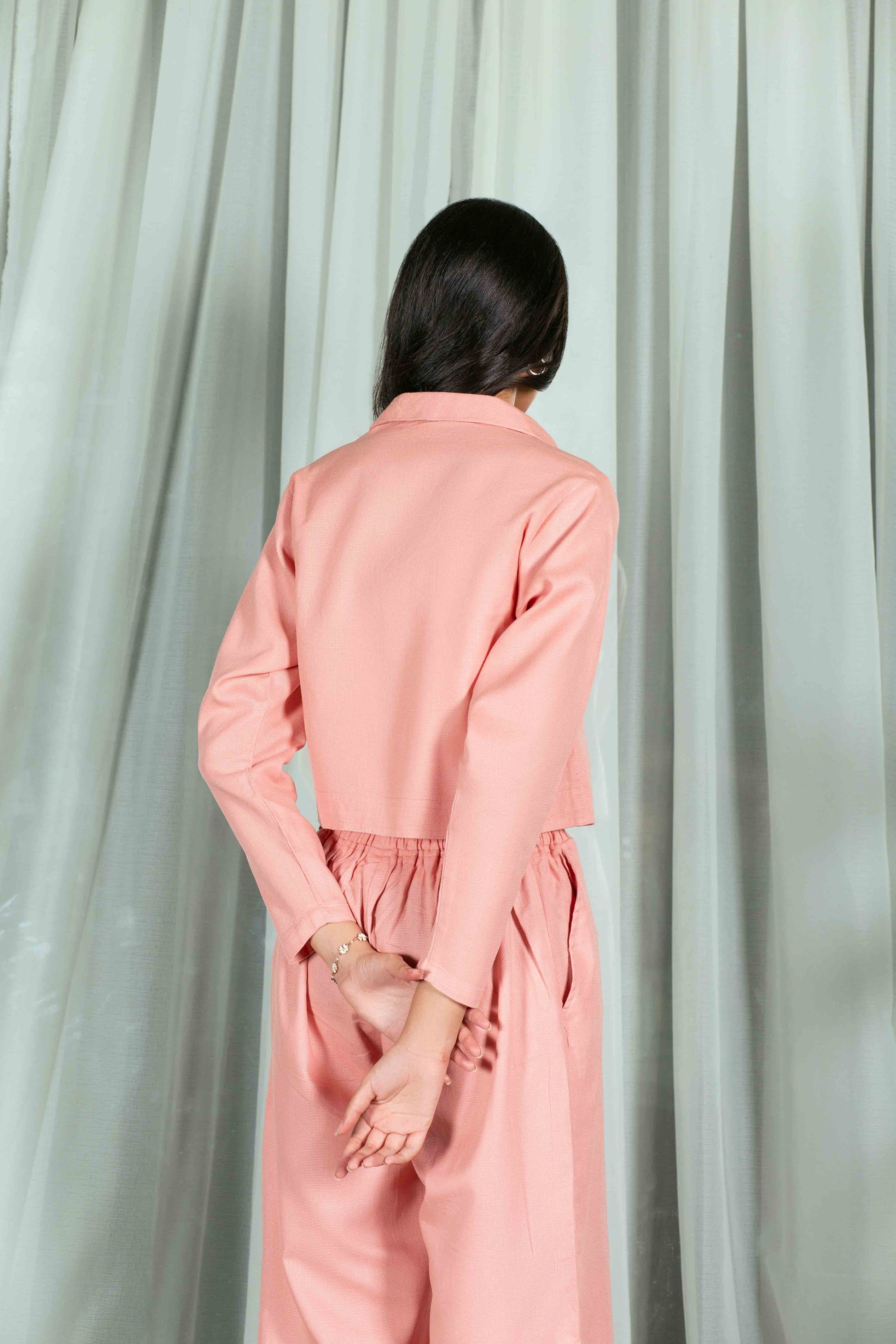 Collared metallic button up shirt with flap pockets and belt detail at bottom. Cropped length. Long sleeves with self finished hem.
