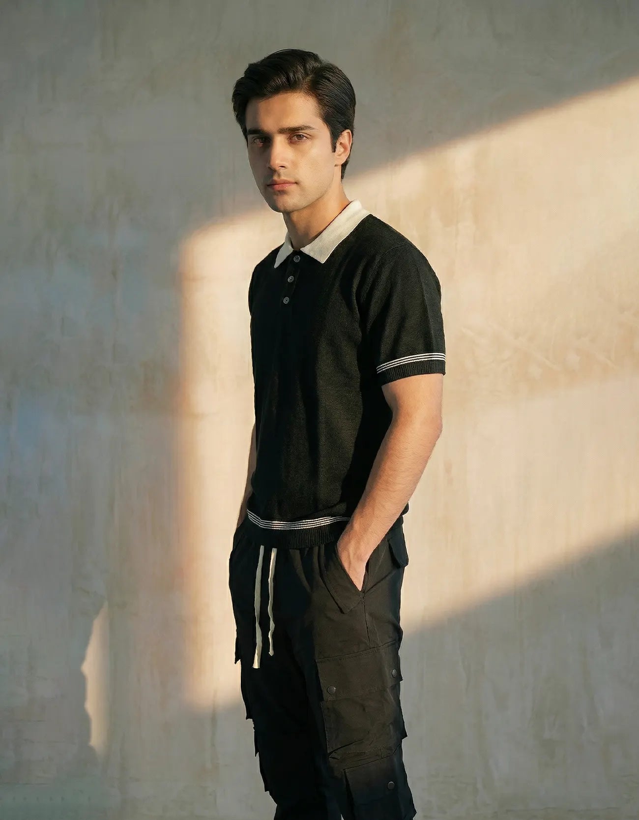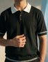 Relaxed fit contrast collar knitted polo with rib detail at sleeves, collar and hem. Short sleeves.