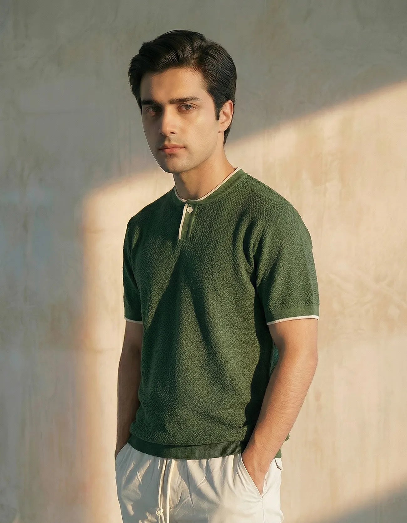 Relaxed fit textured henley shirt with contrast tipping at neck and button closure. Short sleeves.