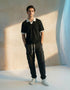 Loose fit textured johnny collar shirt with contrast rib at sleeves, collar and hem. Short sleeves.