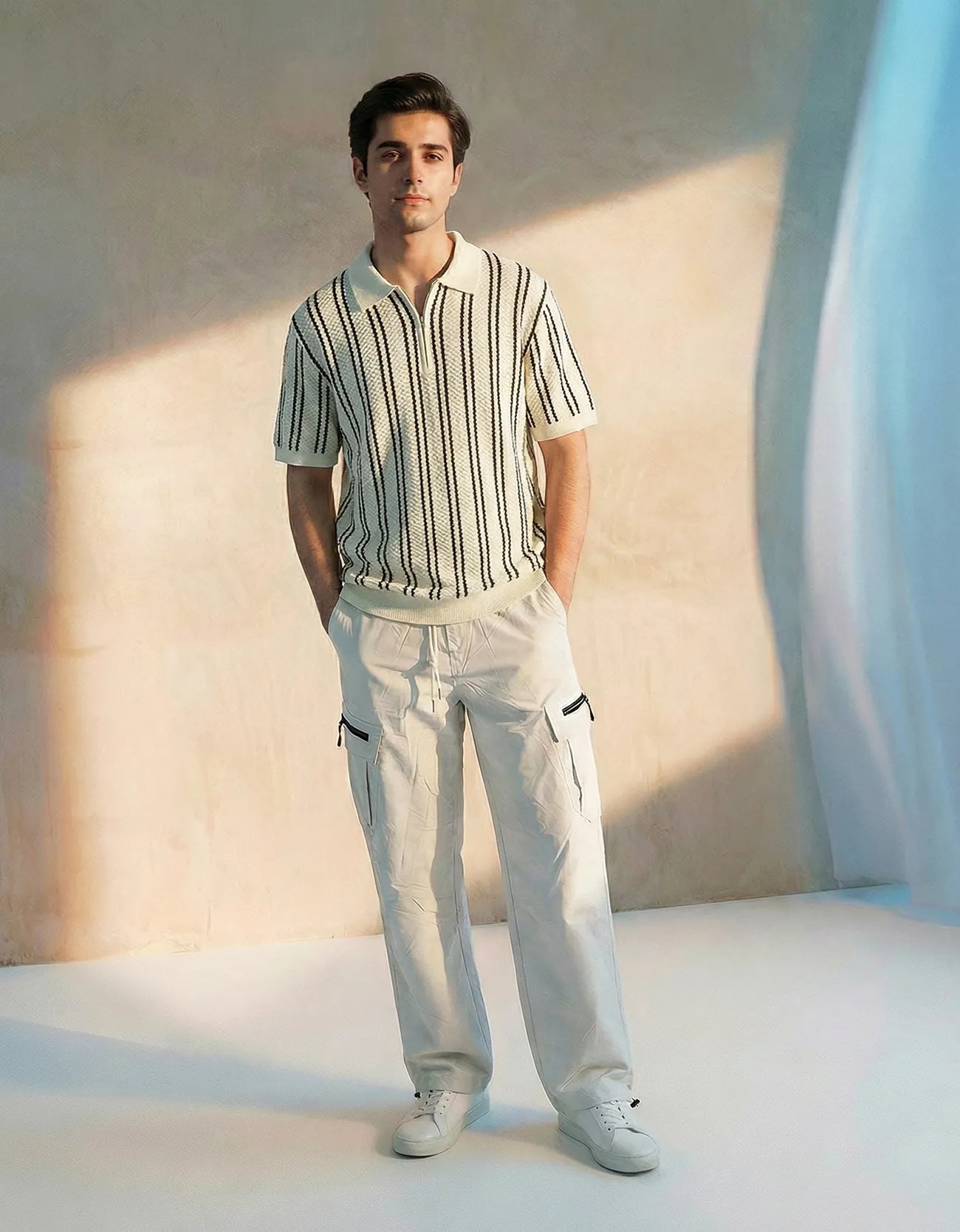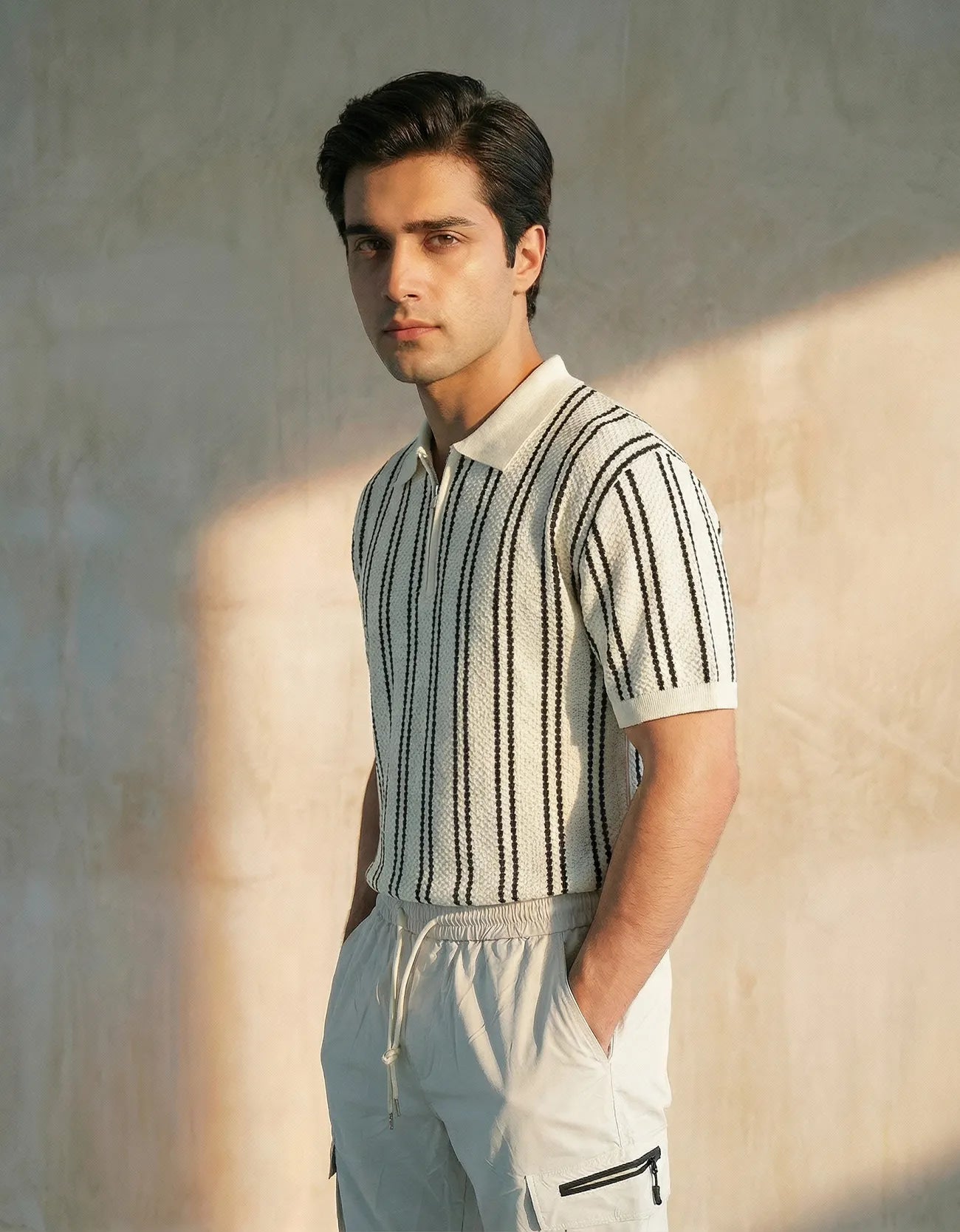 Relaxed fit textured Knitted Quarter zipper shirt with dtm rib at sleeves, collar and hem. Short sleeves.