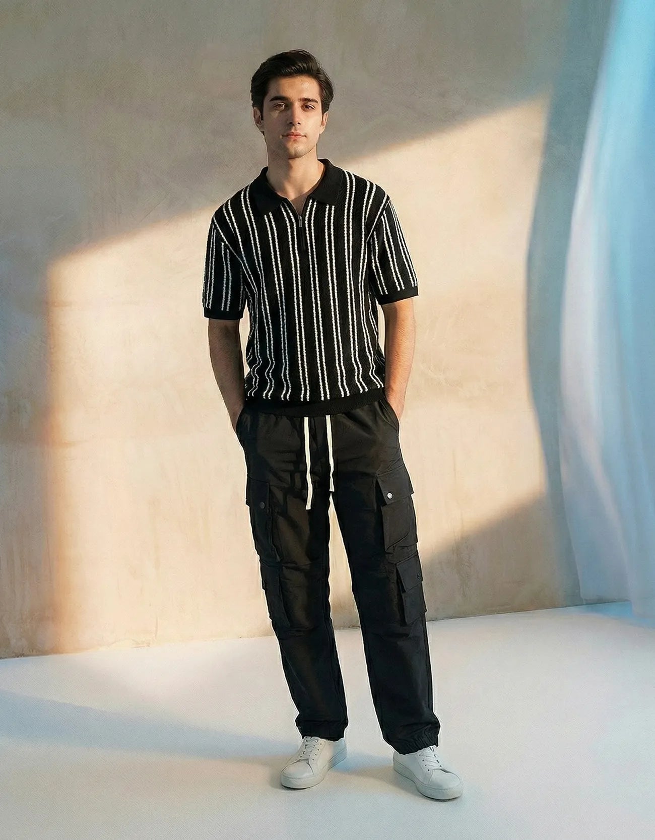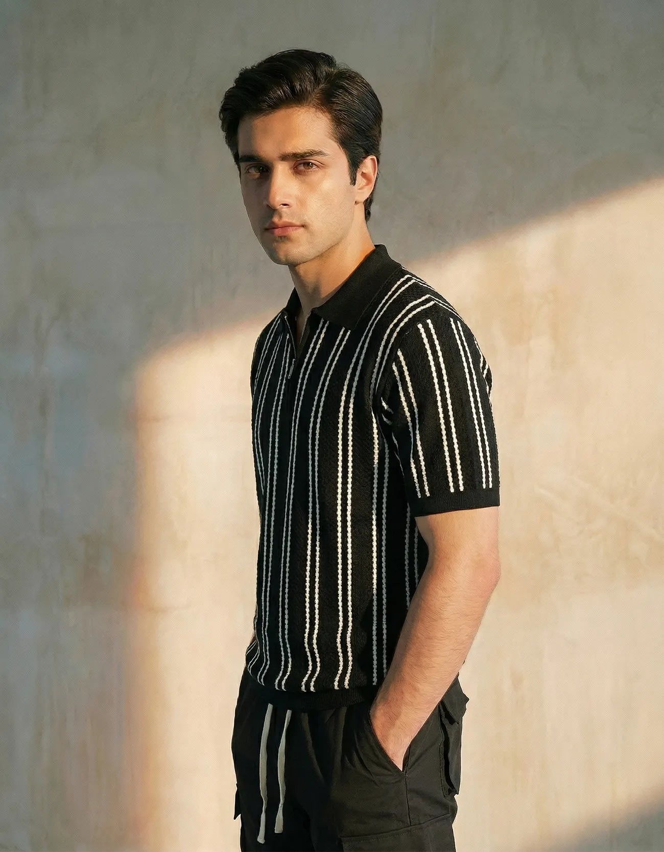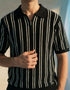 Relaxed fit textured Knitted Quarter zipper shirt with dtm rib at sleeves, collar and hem. Short sleeves.