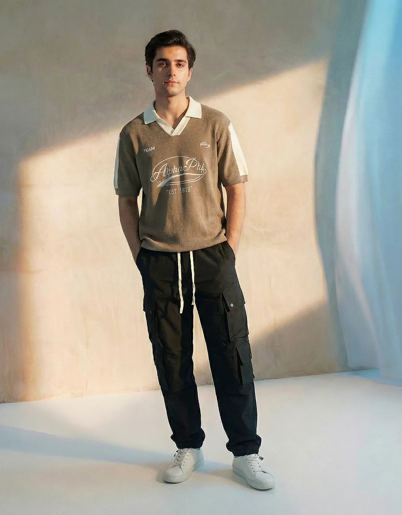 Relaxed fit johnny collar polo with contrast rib at sleeves, collar and hem. Text detail on the front. Short sleeves