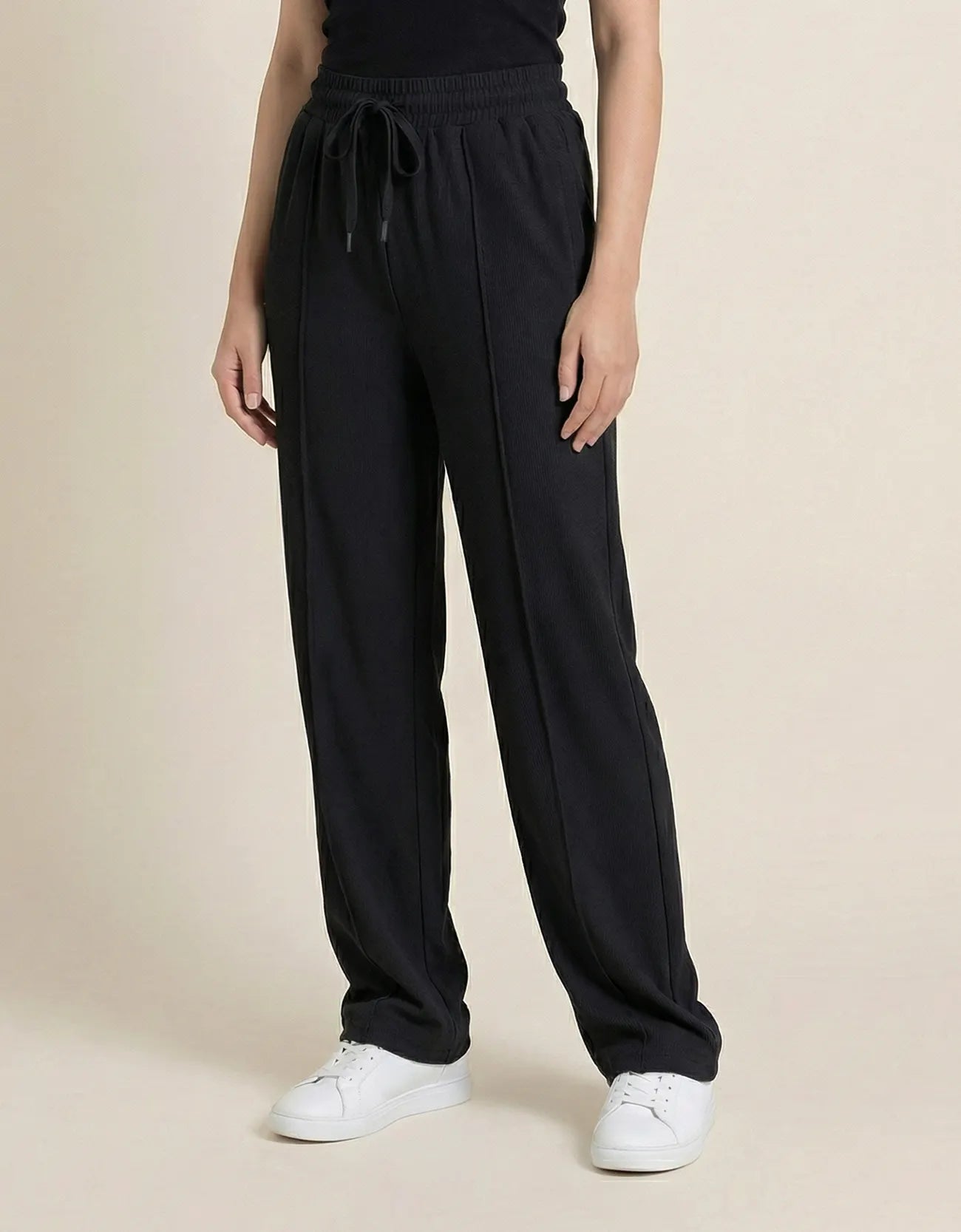 Loose fit ribbed wide bottom trousers, elasticated waistband with an adjustable drawstring and splits at the side seam.