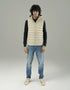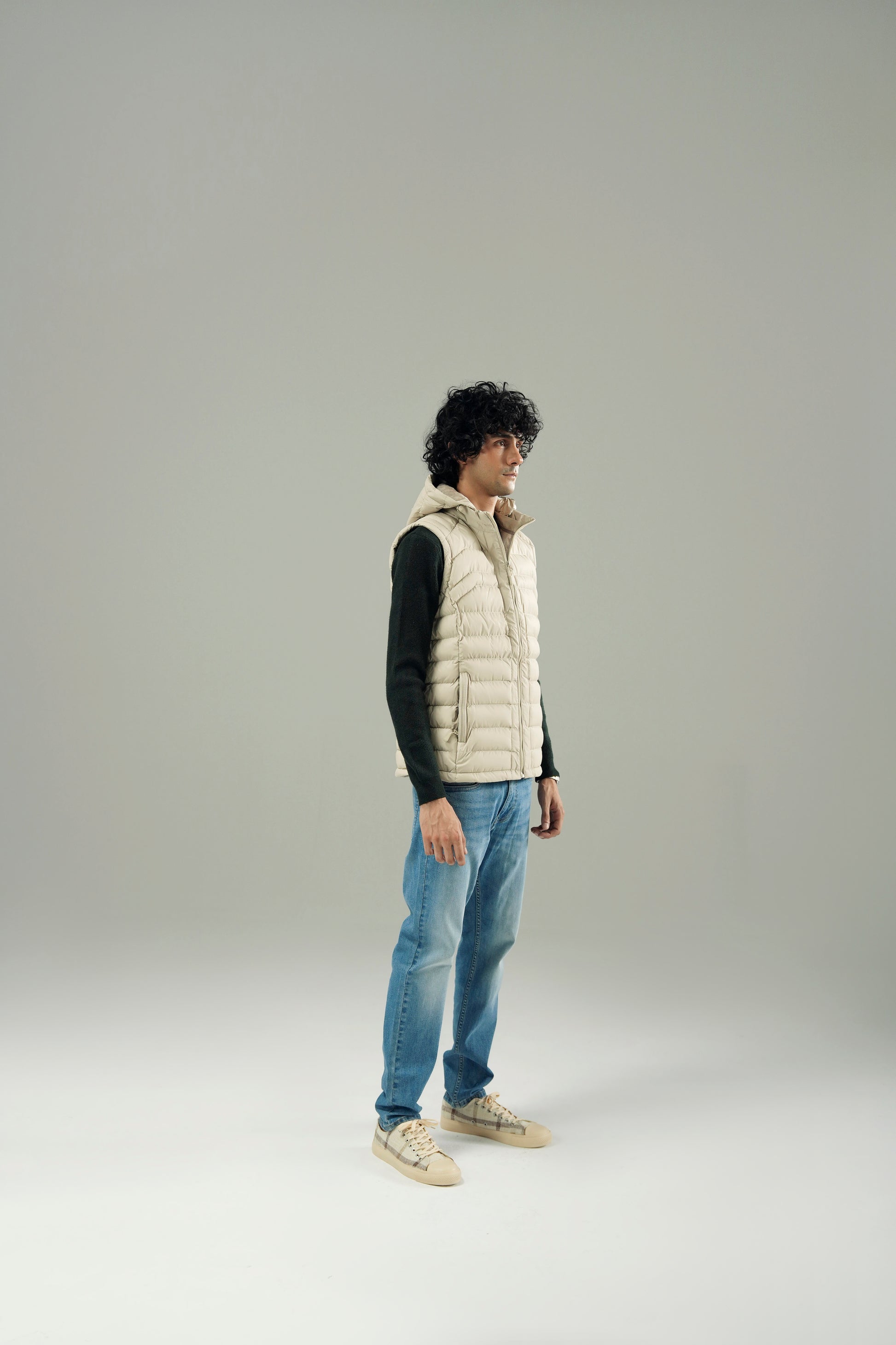 Unisex loose-fit sleeveless puffer jacket with high collar. Detachable hood with front zip closure. Welt pockets with zipper opening and panel detail on the front. Lined inside for smooth finish.