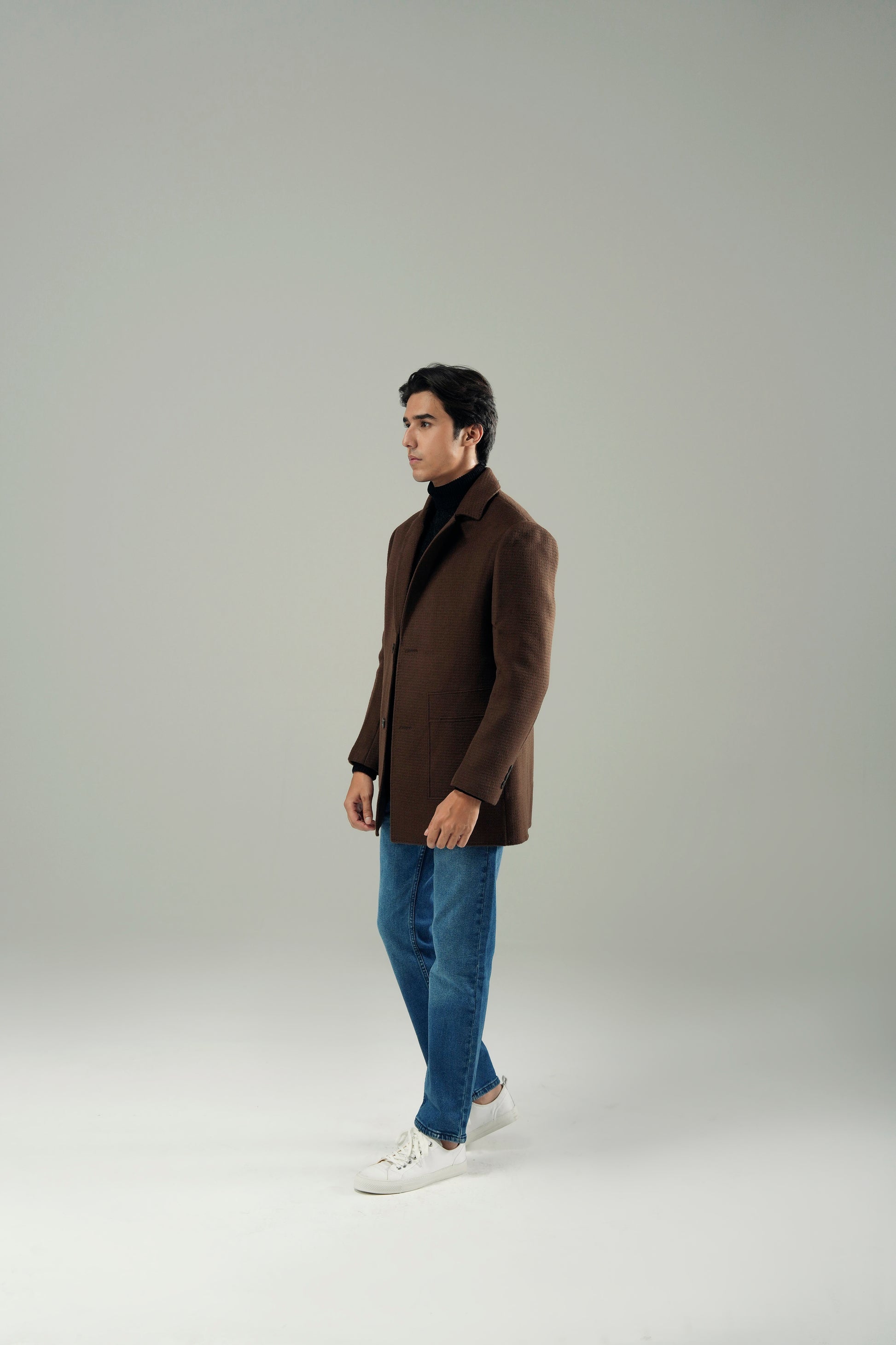 Regular-fit classic style woolen overcoat with notched lapel collar. Button fastening at the front. Long sleeves. False flap and patch pocket detail at the front. Lined inside for smooth finish.