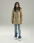 Loose-fit wind resistant puffer with buttoned high neck collar and detachable fuax fur hood. Long sleeves with cuffs. Adjustable drawcords around the waist with metal tipping. Front fastening with a hidden zip and snap buttons. Flap pockets detail at the front. Lined inside for smooth finish.