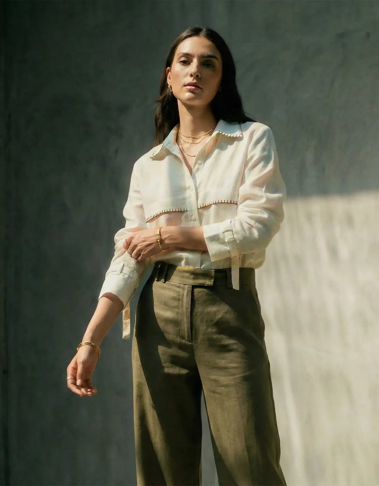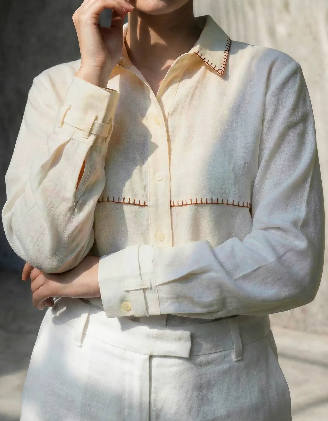 Linen loose fit shirt with embroidered collar and yoke detail on the front. Front button closure. Long sleeves with drop shoulders and Knot-strap detail.