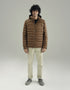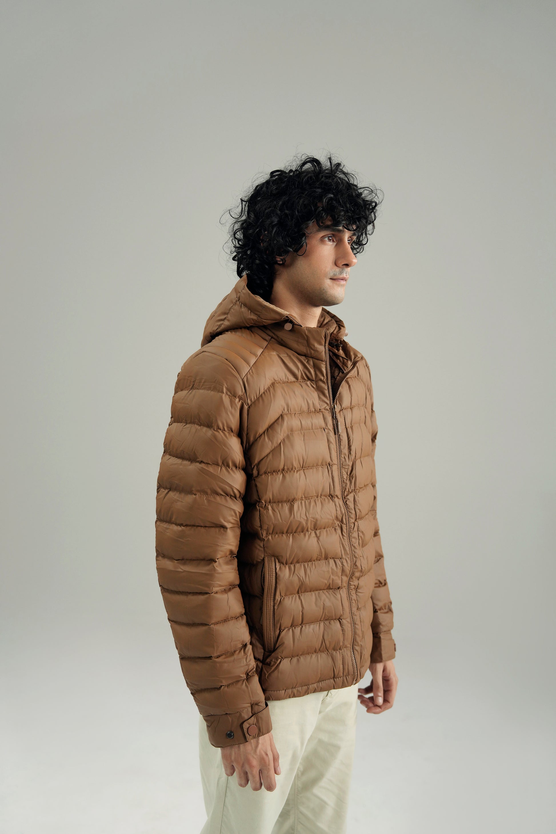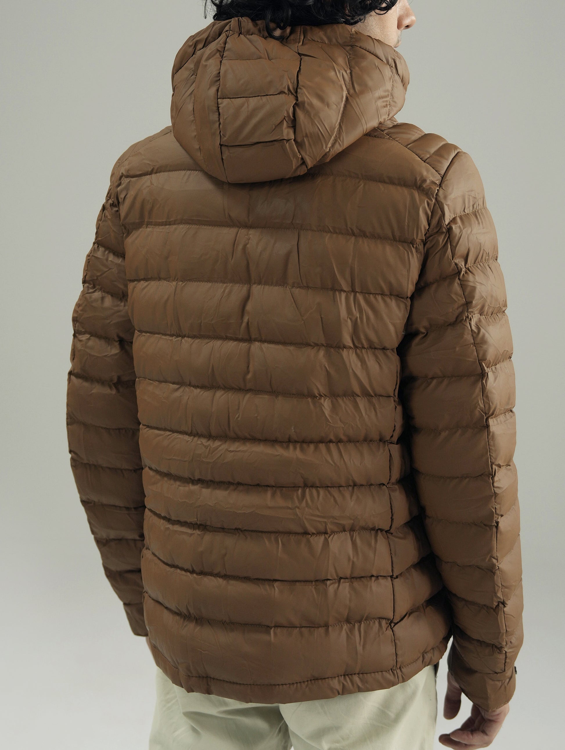 Loose-fit yoke detail wind resistant puffer with zipper high neck collar and hood. Long sleeves with cuffs. Zipper pockets with yoke detail at front. Lined inside for smooth finish.