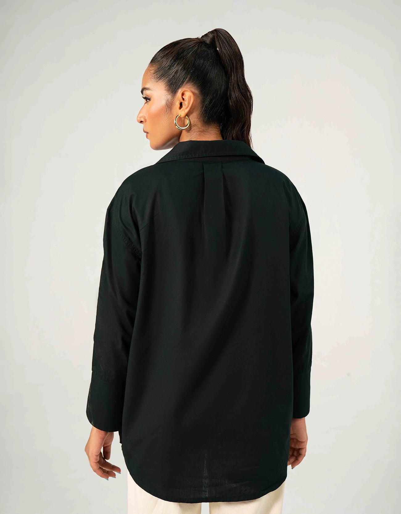 Lose fit overshirt in poplin with front button opening. Drop shoulders with full sleeves and buttoned cuffs. Pleat detail at the back and printed patch pocket on the front.