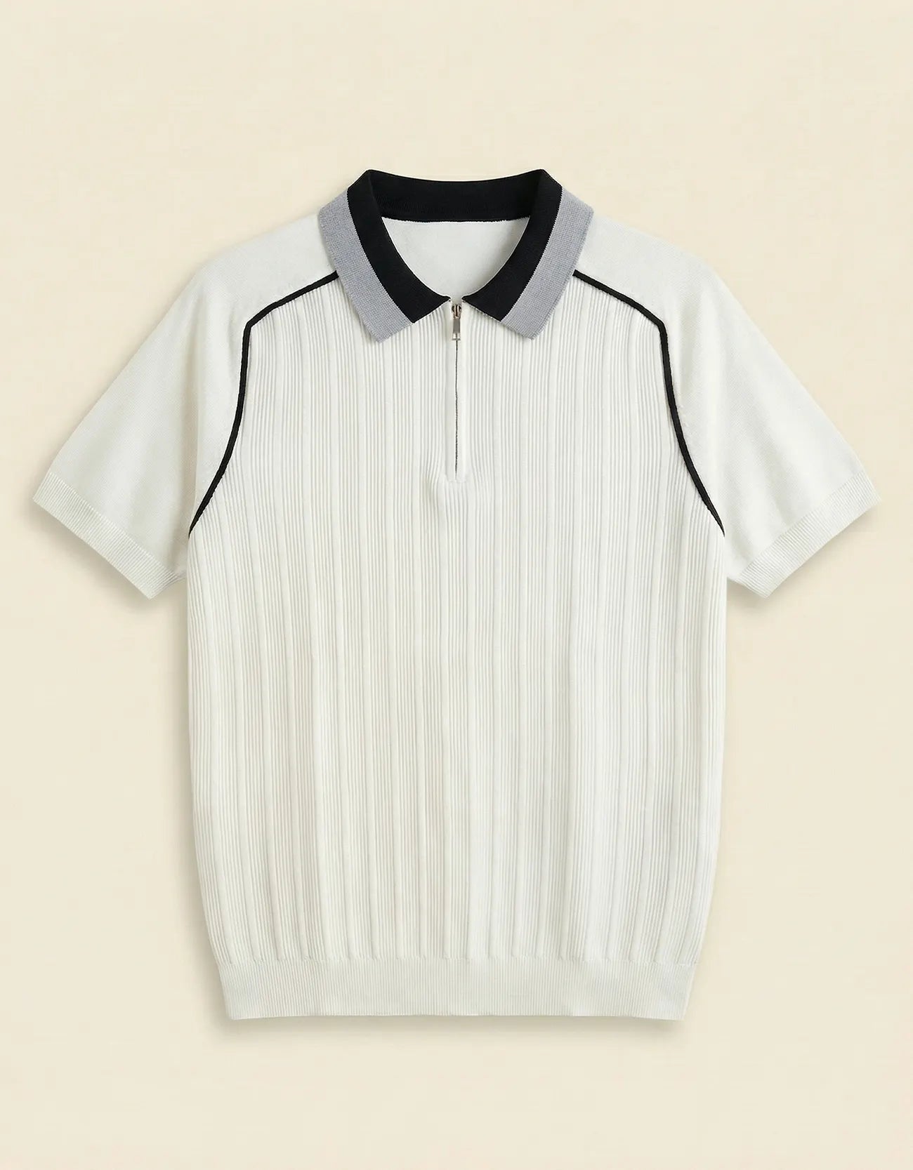 Relaxed fit ribbed quarter zipper raglan shirt with piping and ribbed collar, sleeves and hem. Short sleeves.