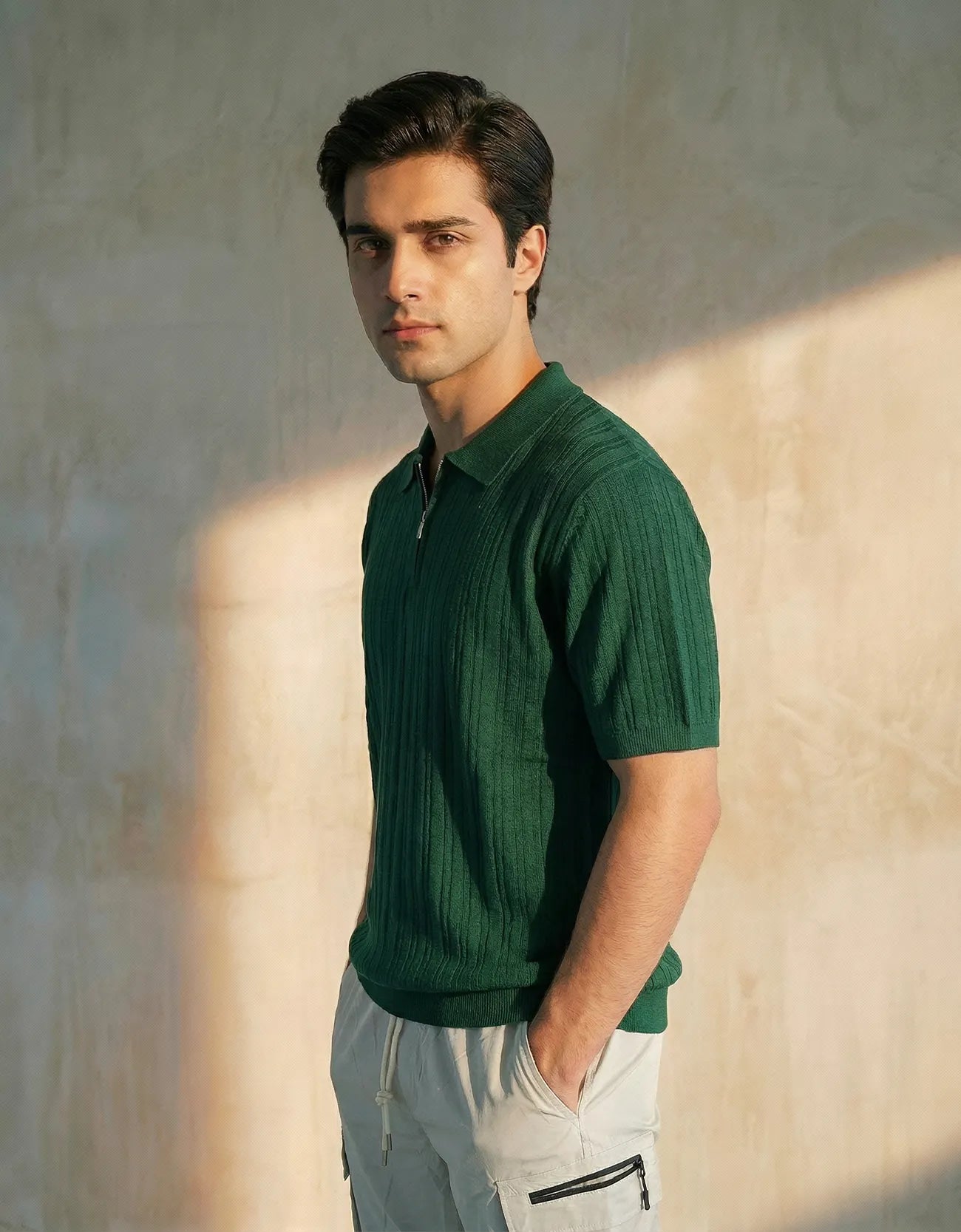 Regular fit textured crushed polo with dtm rib detail at sleeves, collar and hem. Short sleeves.