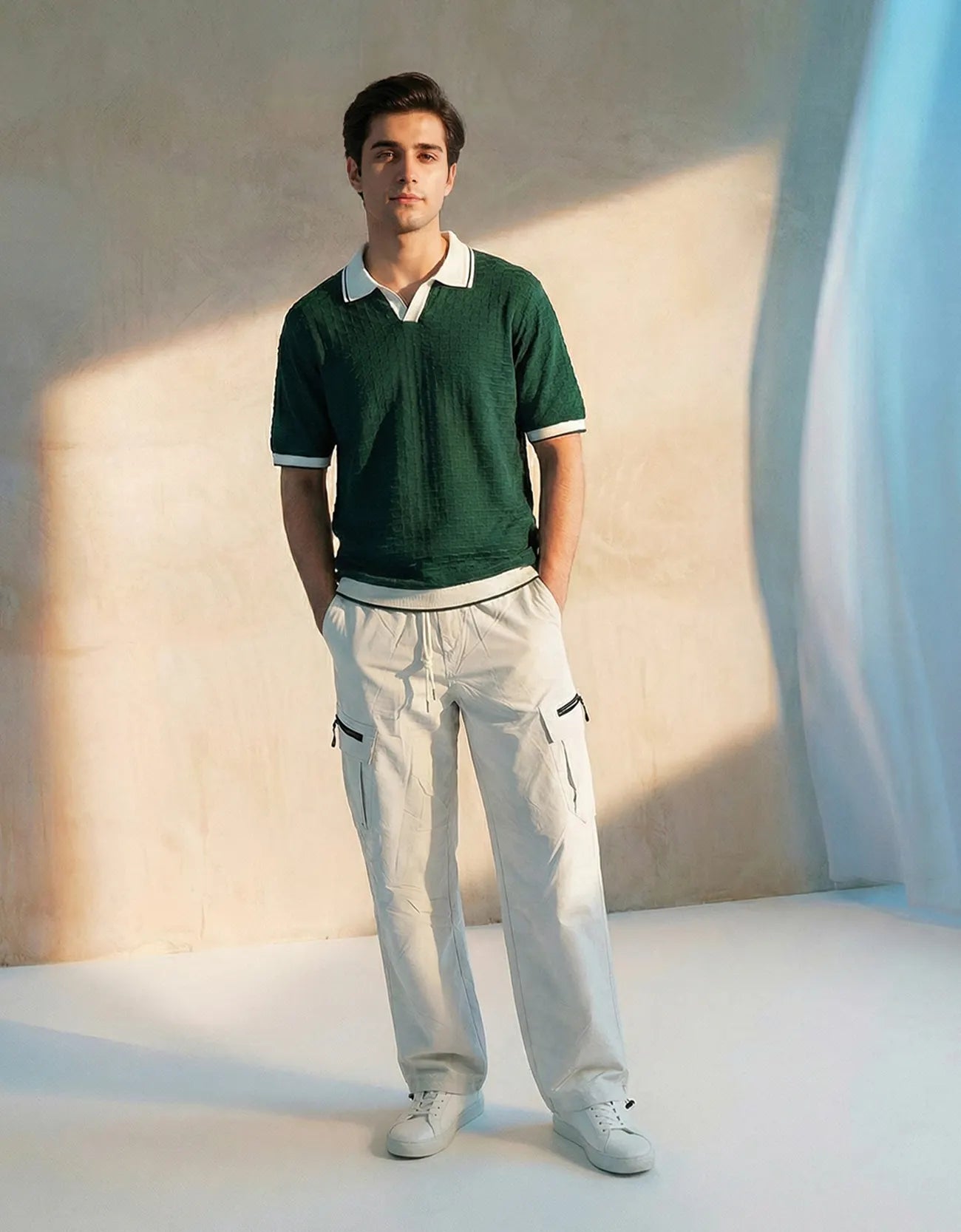 Loose fit textured johnny collar shirt with contrast rib at sleeves, collar and hem. Short sleeves.
