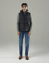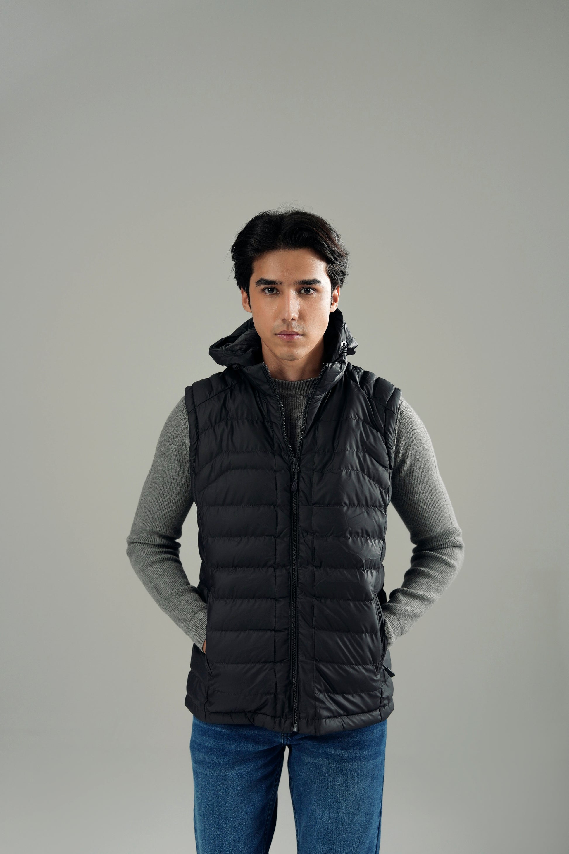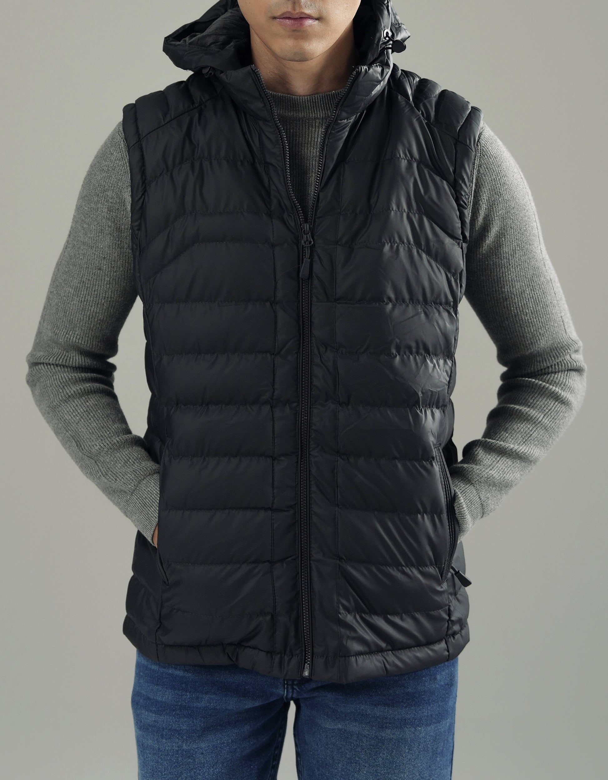 Unisex loose-fit sleeveless puffer jacket with high collar. Detachable hood with front zip closure. Welt pockets with zipper opening and panel detail on the front. Lined inside for smooth finish