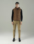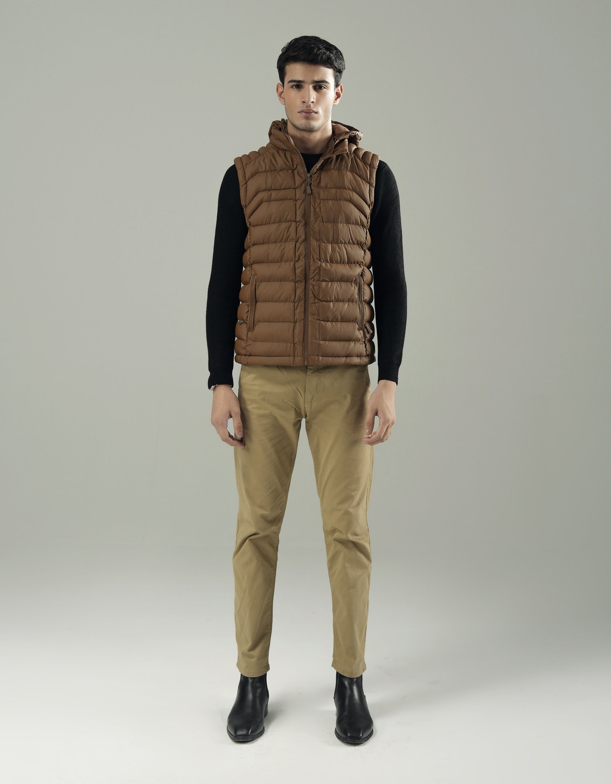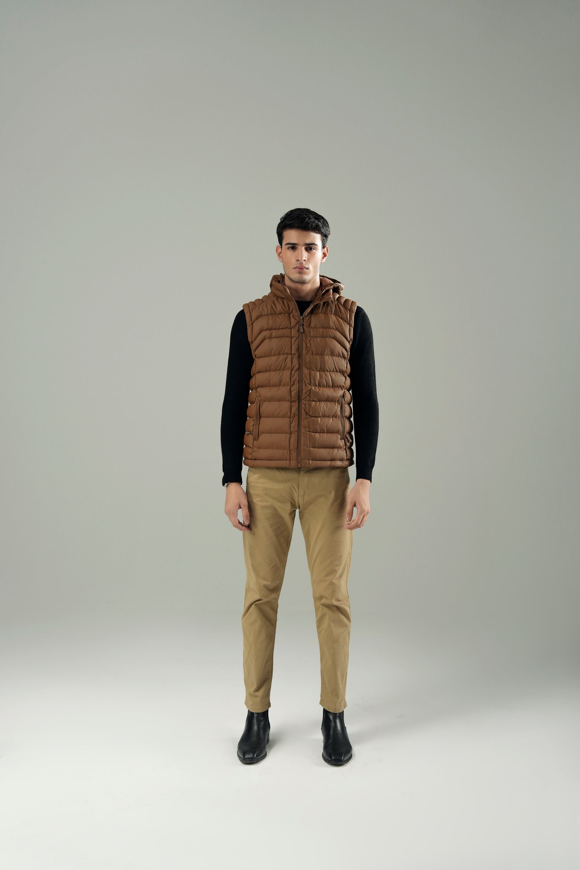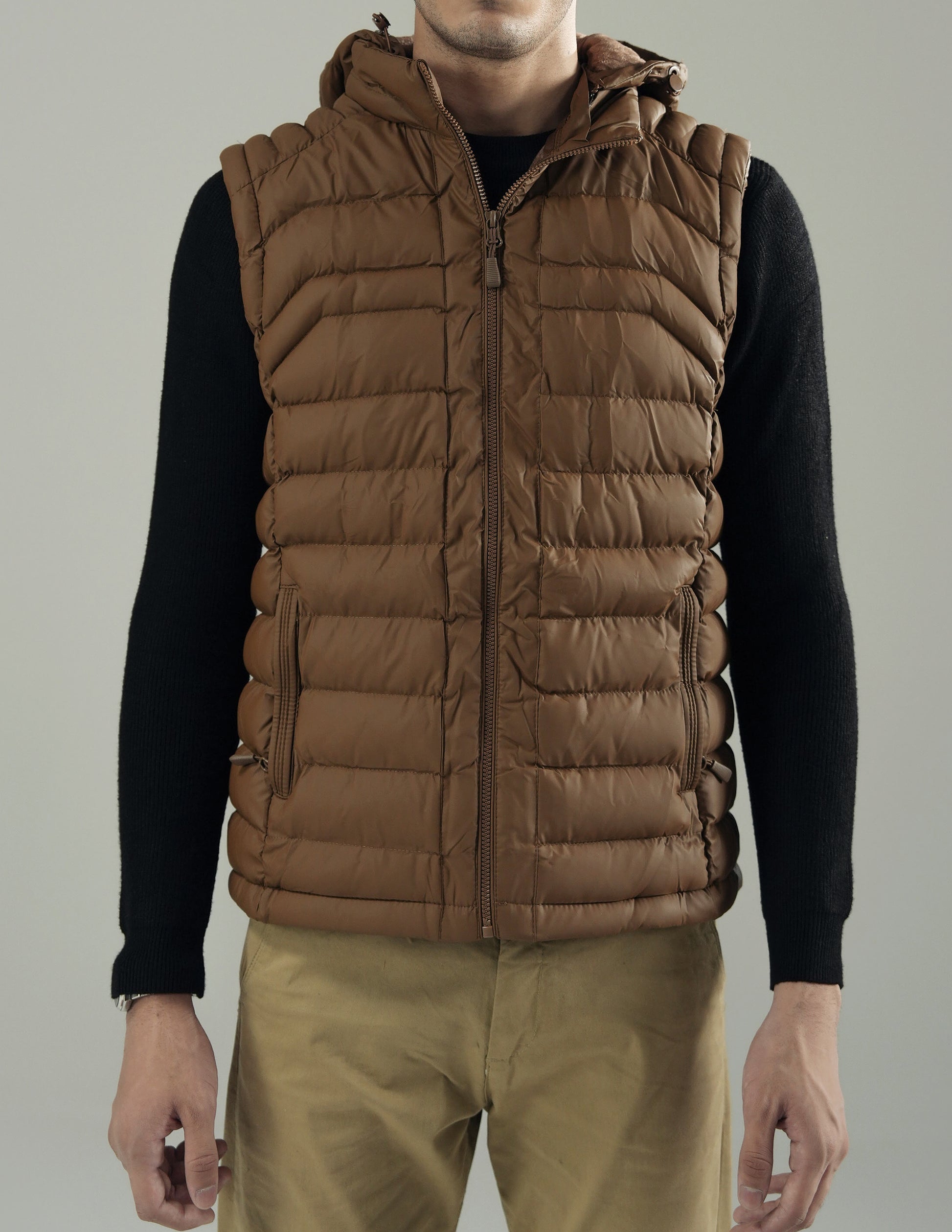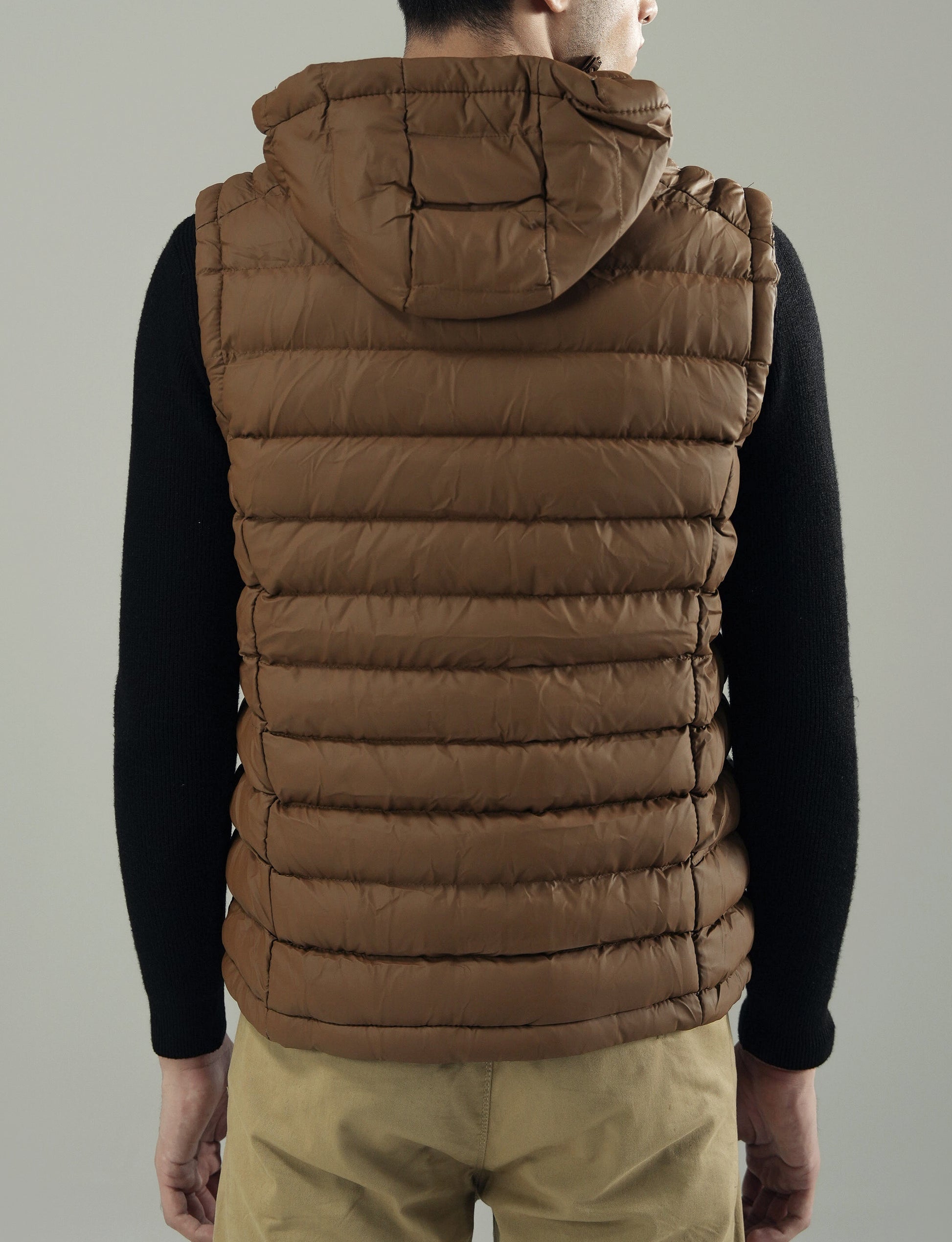 Unisex loose-fit sleeveless puffer jacket with high collar. Detachable hood with front zip closure. Welt pockets with zipper opening and panel detail on the front. Lined inside for smooth finish.