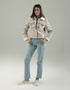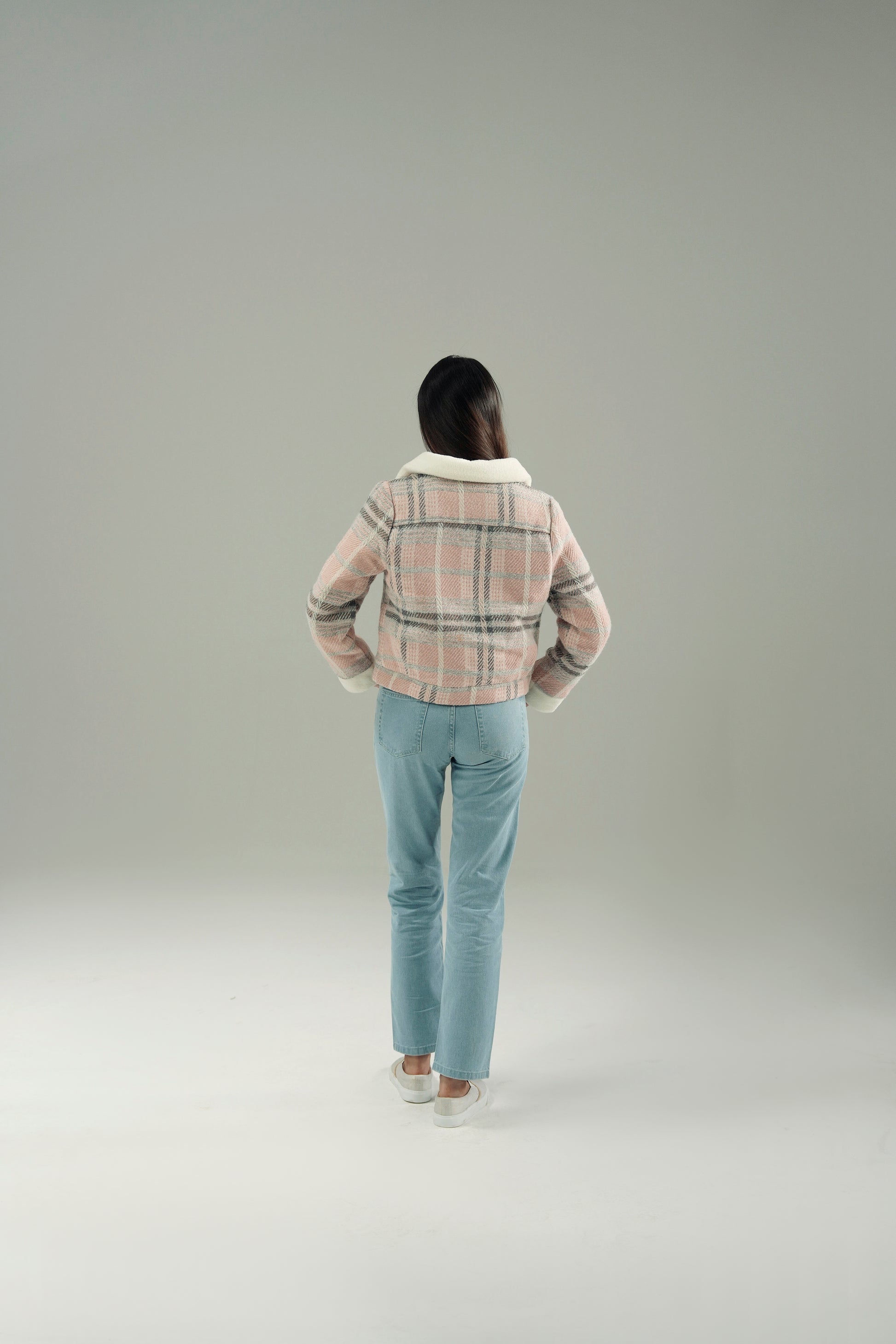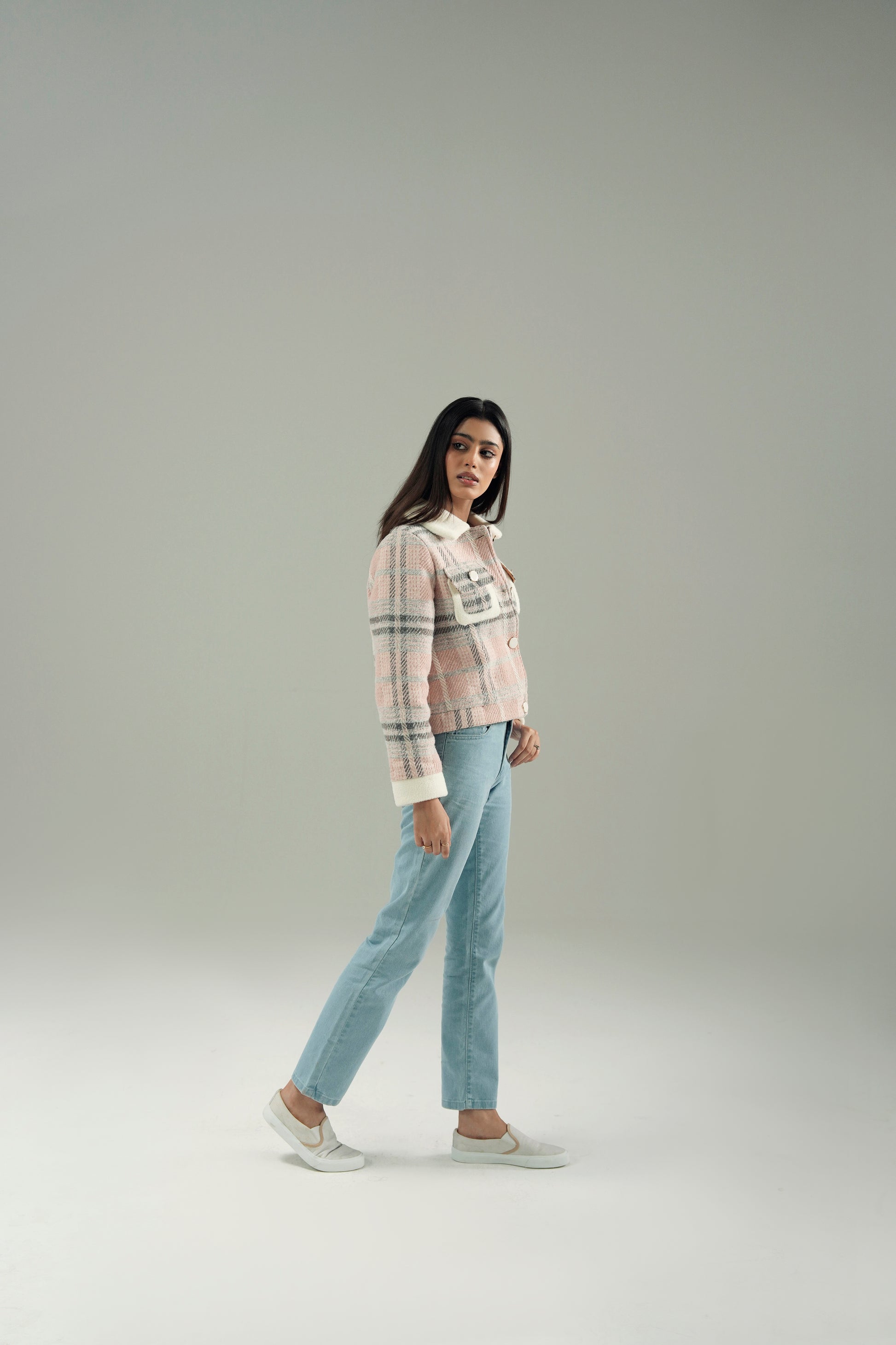 Regular fit wool blended cropped jacket with played pattern. Fur texture woollen collar. Flap pockets on the front with button and woollen trim detail. Front button fastening. Long sleeves and woollen trim detail at opening. Lined with silk for smooth finish.